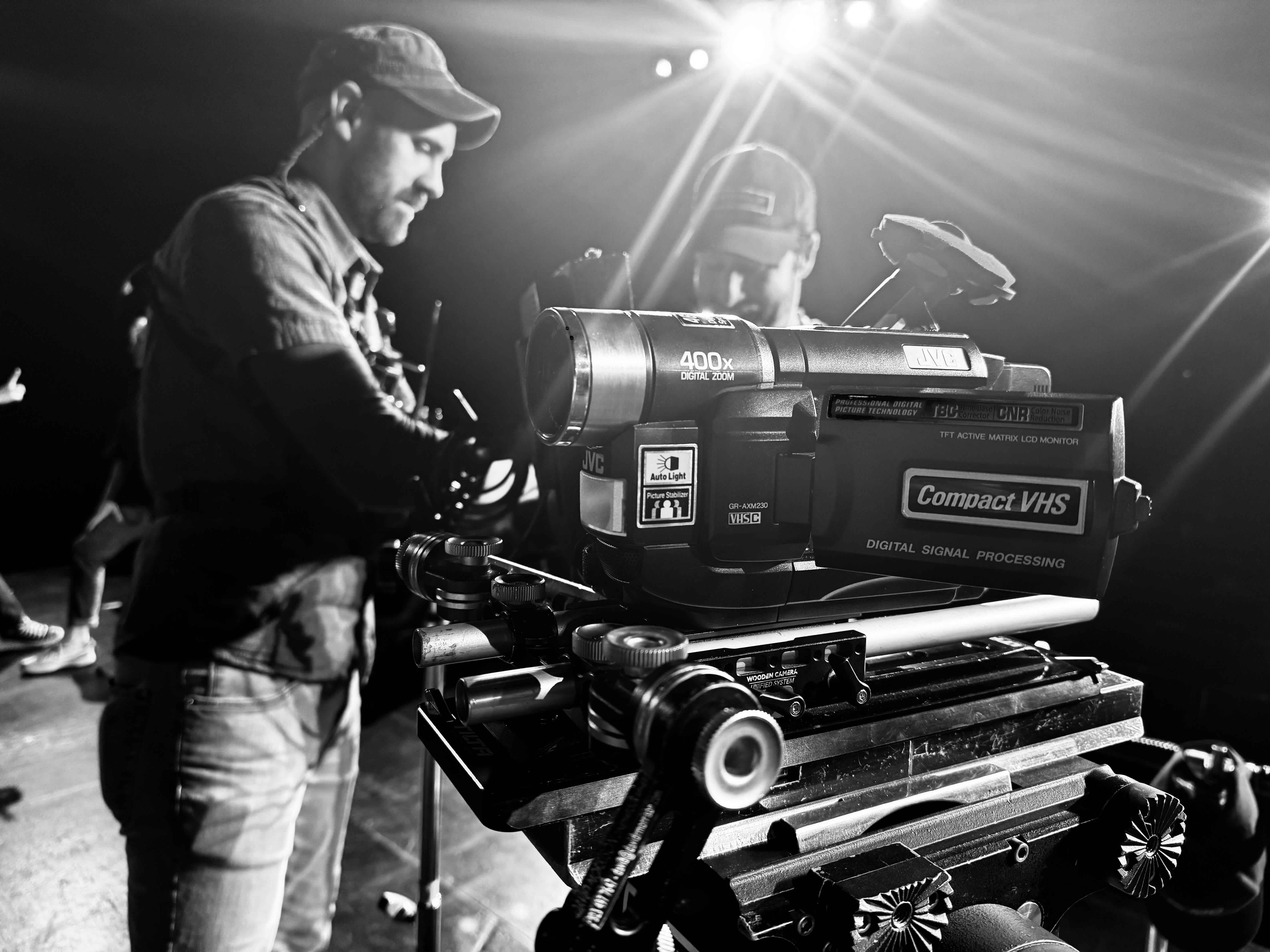 Colin Garcia and Geoff Storts prep a Super VHS camera for the next take on the set of SHE DANCES. Image courtesy of David Morrison/Macaroni Art Productions.