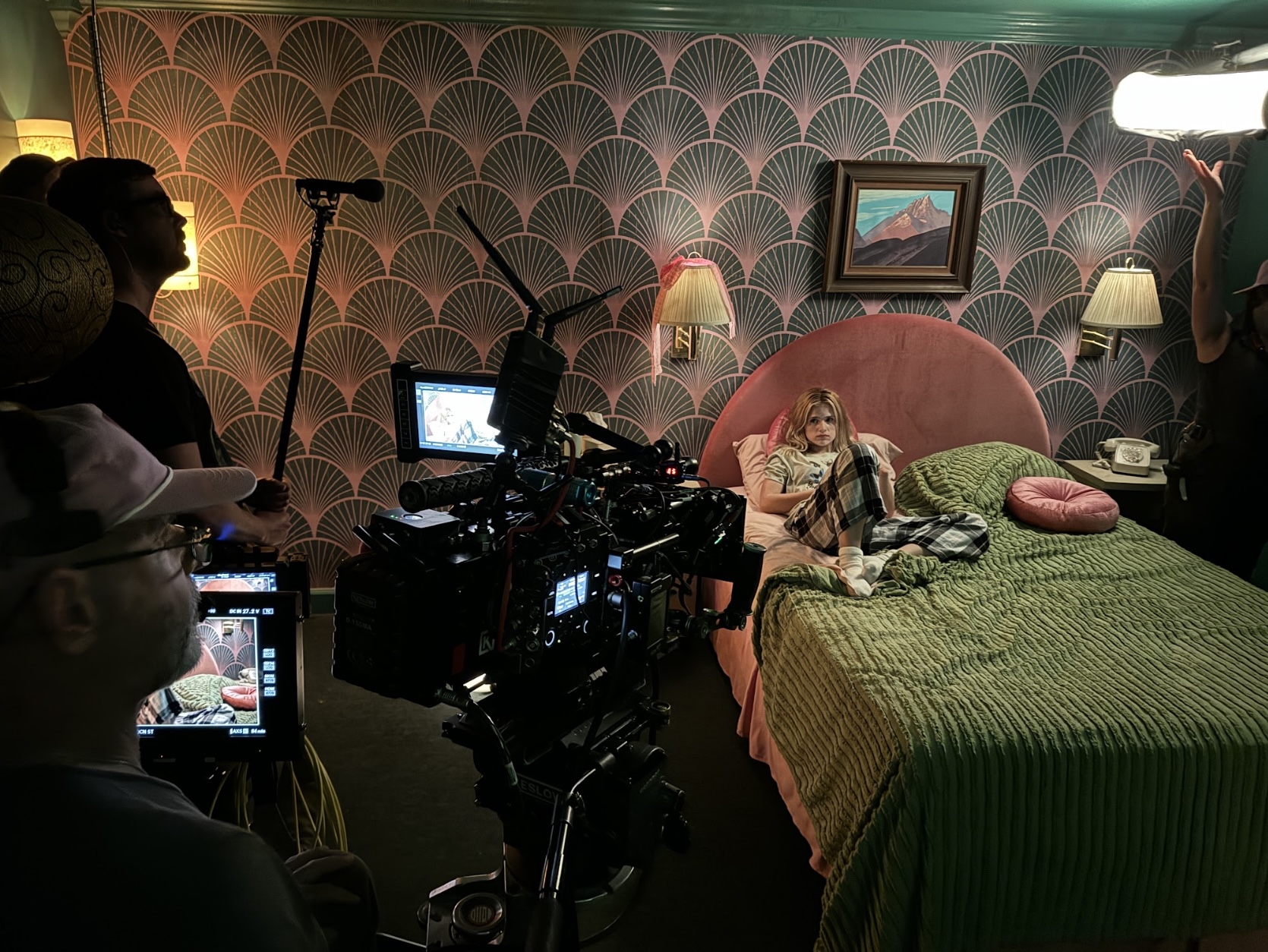 For the dance sequences' cooler, saturated blue palette — and for the colored light bleeding through the motel windows in shades of pink against green wallpaper — Morrison looked to cross-backlight as a foundation. "Nothing is better than cross-backlight for dance," he says, citing Vittorio Storaro as a touchstone. B-camera operator Ashley Hughes, a former dancer herself, was positioned to maximize flare and backlight throughout. "There's a certain explosiveness to it."