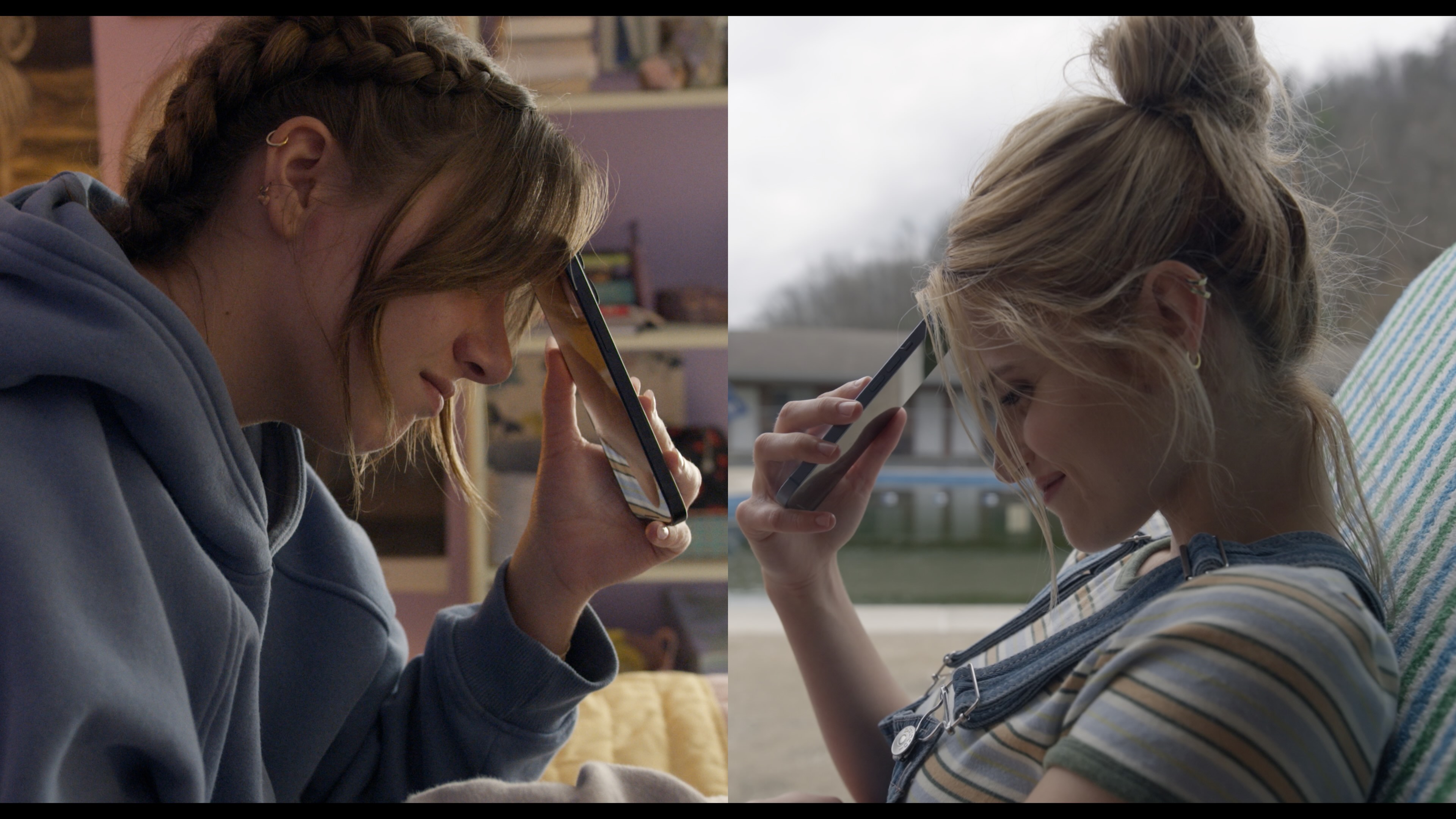 The most technically demanding split-screen sequence — the FaceTime call between Claire and Kat — required two camera crews positioned roughly 300 yards apart in the rural Kentucky hills, with unreliable Wi-Fi and only Gomez able to monitor both feeds simultaneously. "He wanted to see their phones on screen at certain times," Morrison recalls. "He just wrote it out: 'I want to be here on this, here on this.' It's like two band members learning music — you rehearse the scene, they're just beats, and you know your beats." Shooting the sequence took approximately seven takes. “We shot the scene, Rick and editor Coby Toland went off to cut it together, while the crew took an hour break. On an independent film that’s unusual — every hour is precious — but when they came back, we all gathered to watch the rough cut of something we had just created together. It was beautifully executed, and the moment brought the crew closer. You could feel that we were making something magical.”