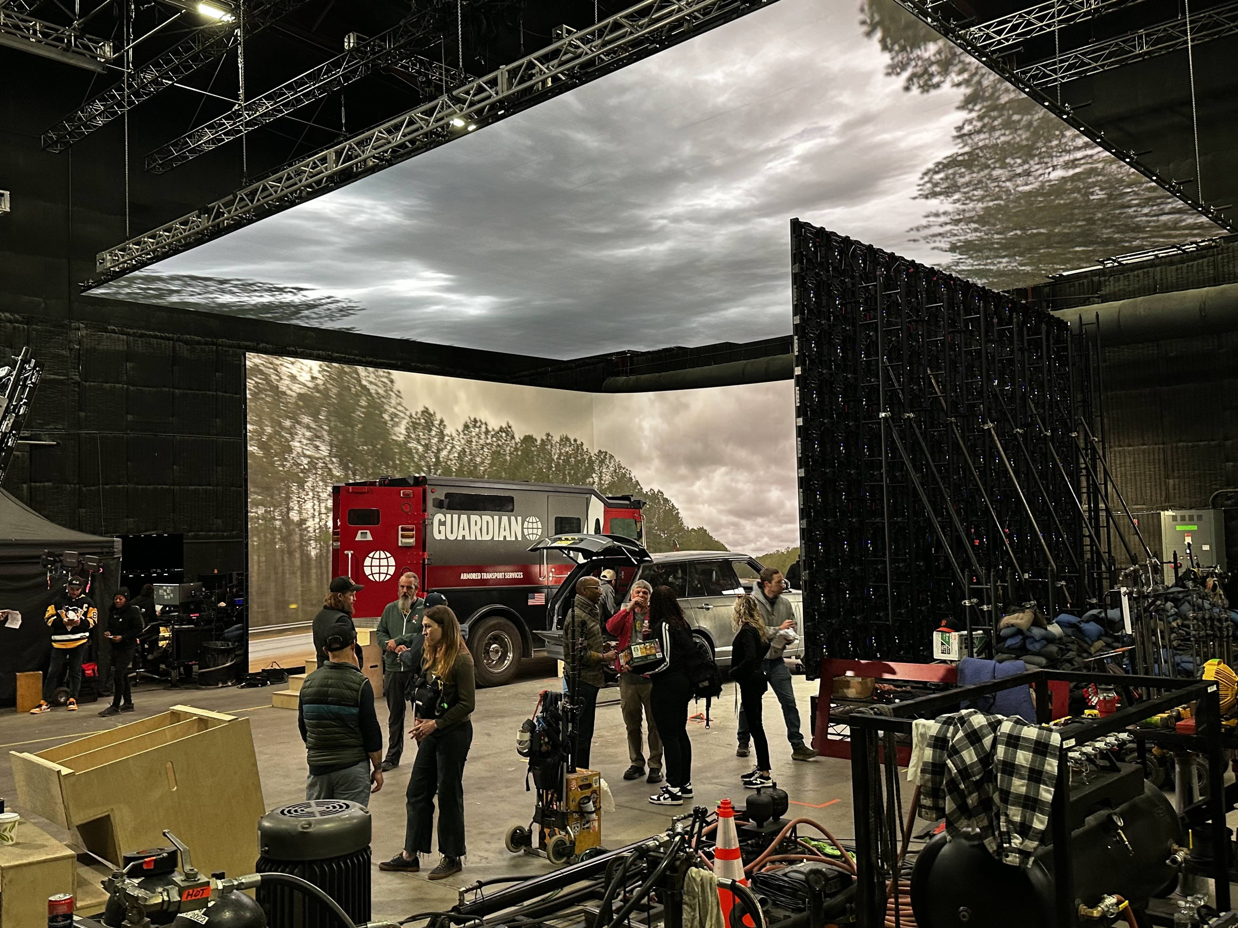 The armored truck on the LED volume wall stage, on set of The Pickup.