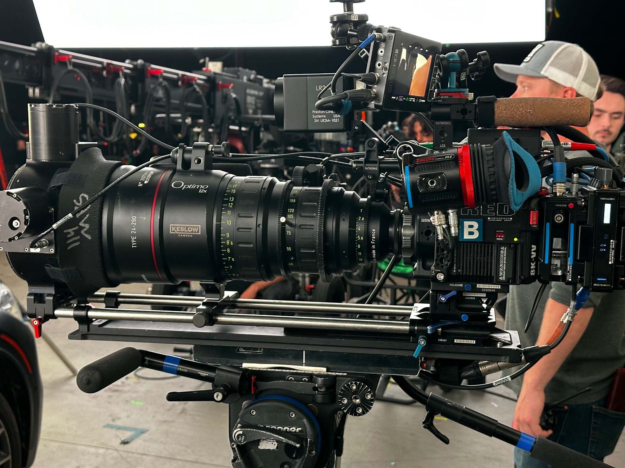 A fully build RED V-Raptor rig with an Angenieux Optimo Zoom on set of The Pickup.